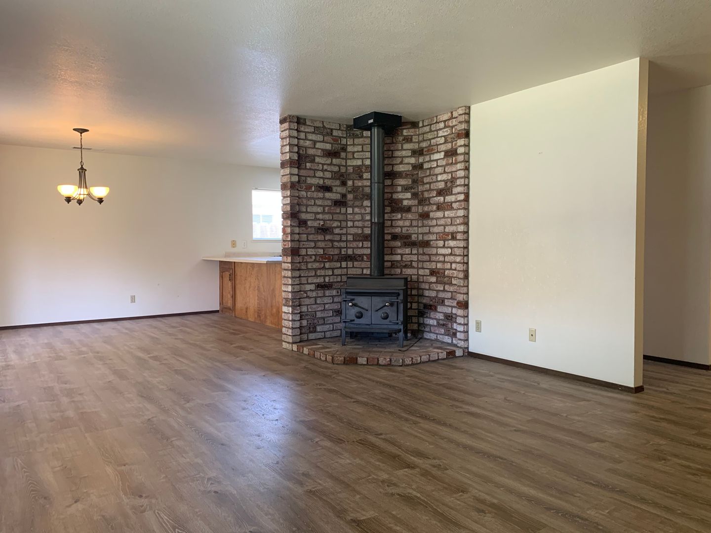 The main living areas offer beautiful LVP flooring, with cozy carpet in the bedrooms for added comfort. The spacious living room is filled with natural light from a large window and features a charming wood stove with a classic brick hearth.