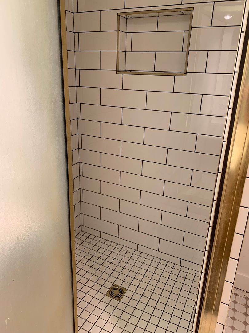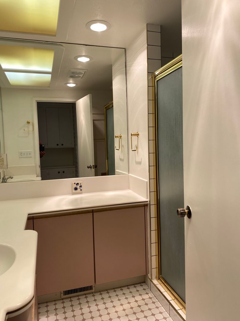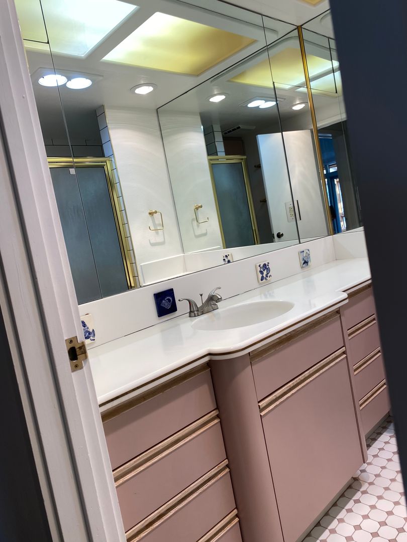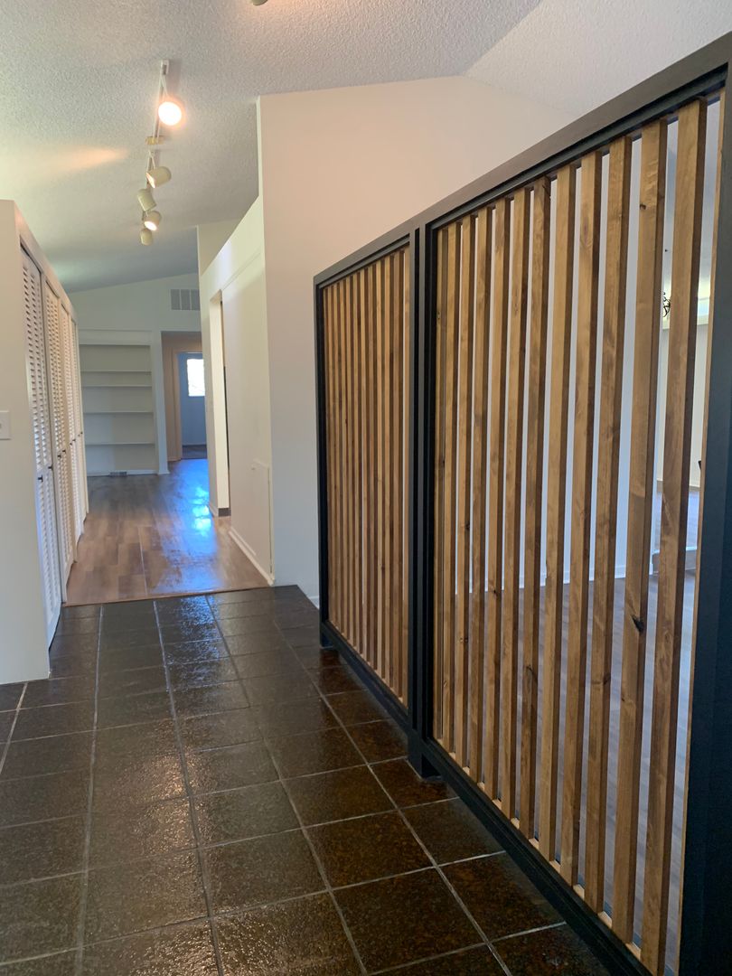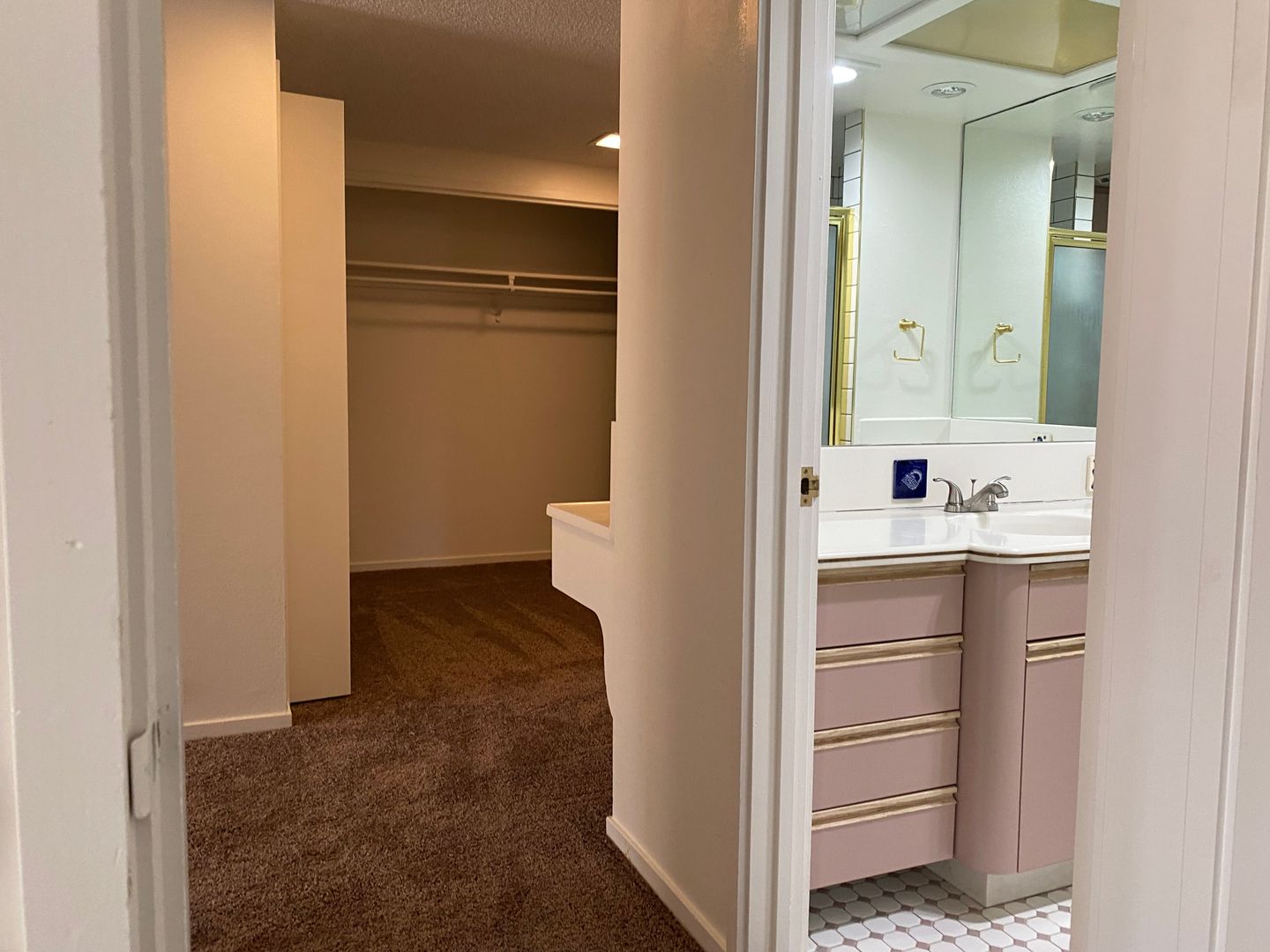 The hallway offers an impressive wall of built-in storage, including shelving, louvered doors, and a built-in desk area. All four bedrooms are generously sized with large windows and updated carpeting. The primary suite includes a mini-split heating and cooling unit, sliding glass doors, built-in cabinetry, and a separate dressing area with additional sink and closet space. The ensuite bathroom features a step-in shower with white subway tile and unique vintage-inspired accents.