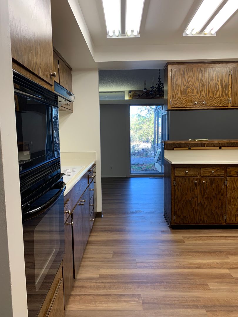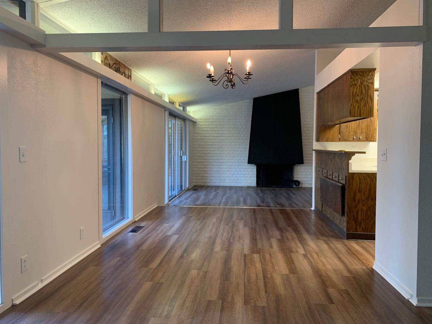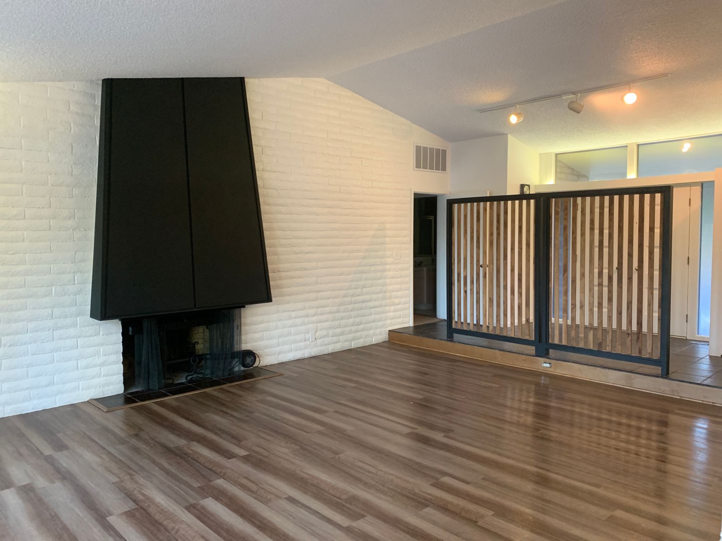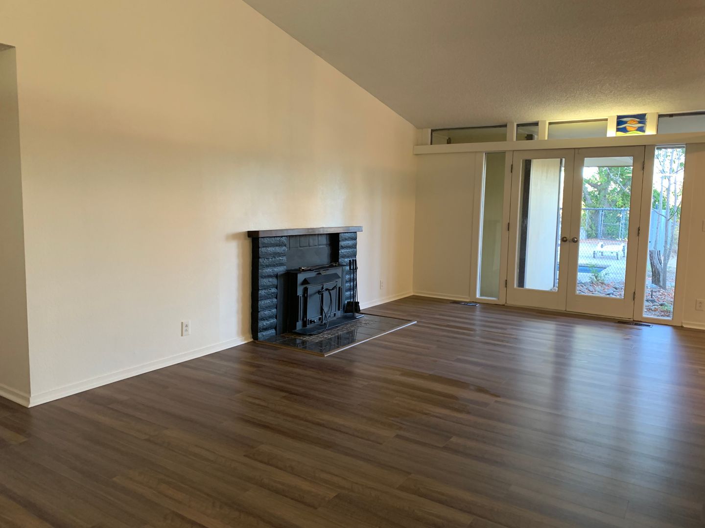 A separate family room provides additional living space, complete with a second wood-burning fireplace and French doors leading out to the patio, pool, and backyard. The kitchen features timeless wood cabinetry and comes equipped with a glass cooktop, oven, microwave, and dishwasher. Refrigerator provided as needed. A dedicated dining area with chandelier sits just off the kitchen.