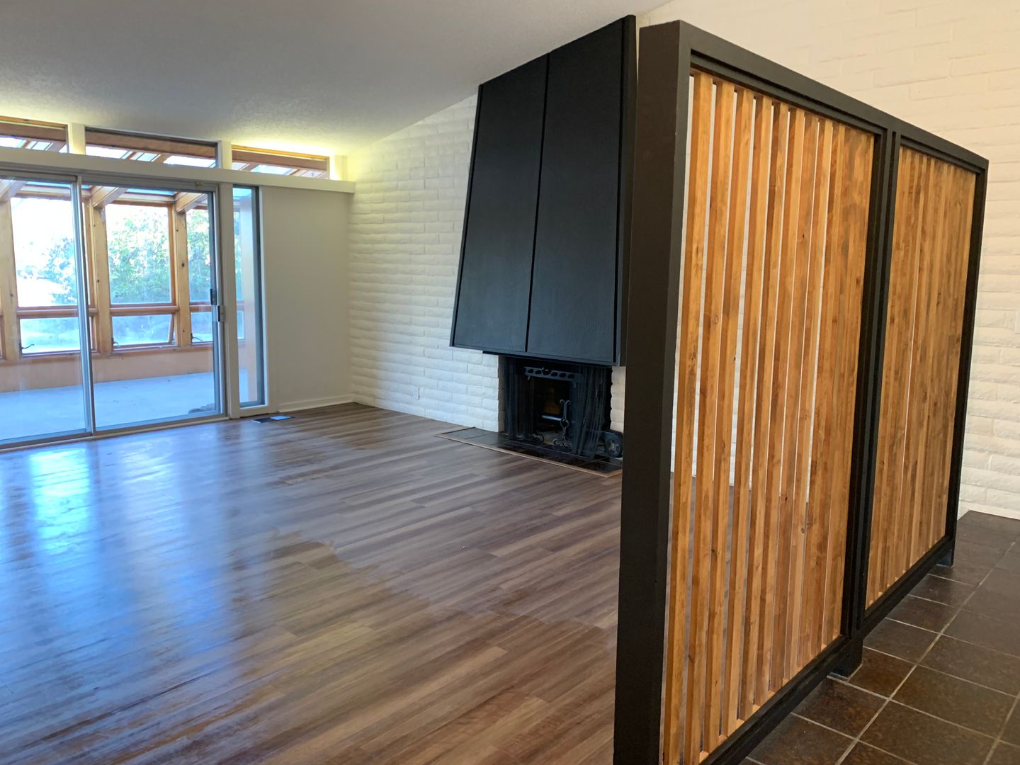 Inside, the sunken living room offers a warm and inviting space with a wood-burning fireplace and French doors that open into a covered sunroom filled with natural light and beautiful river views.