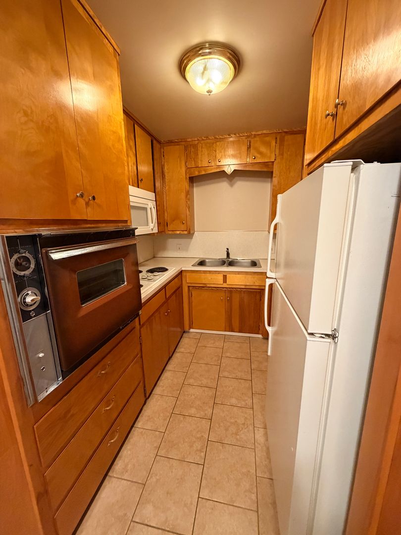 The galley-style kitchen includes well-kept cabinetry, attractive countertops, and appliances such as a refrigerator, electric range, and built-in microwave. Just off the kitchen is a small dining nook.