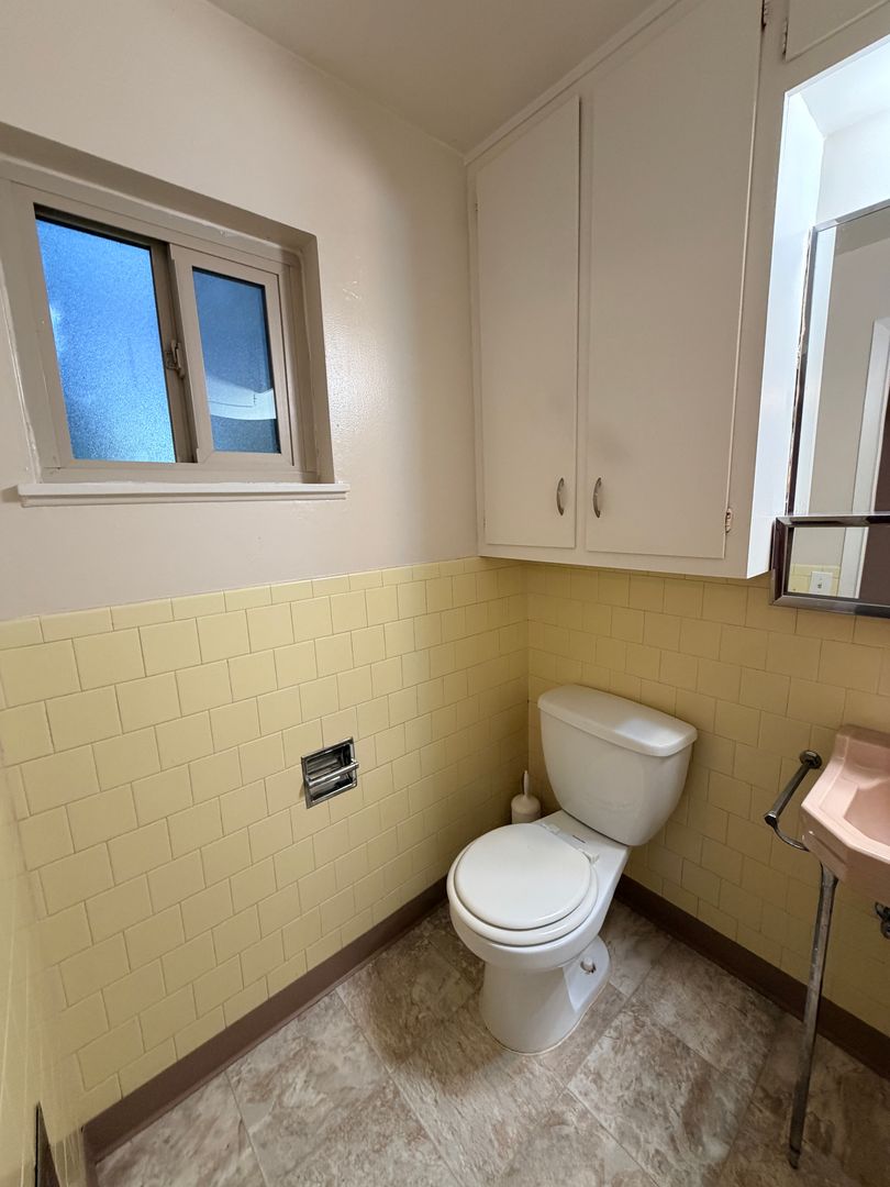 The bedroom is nicely sized with ample light, and the cute full bathroom includes a vintage pink sink, pink tub/shower and yellow tiles.