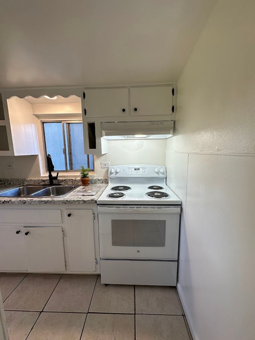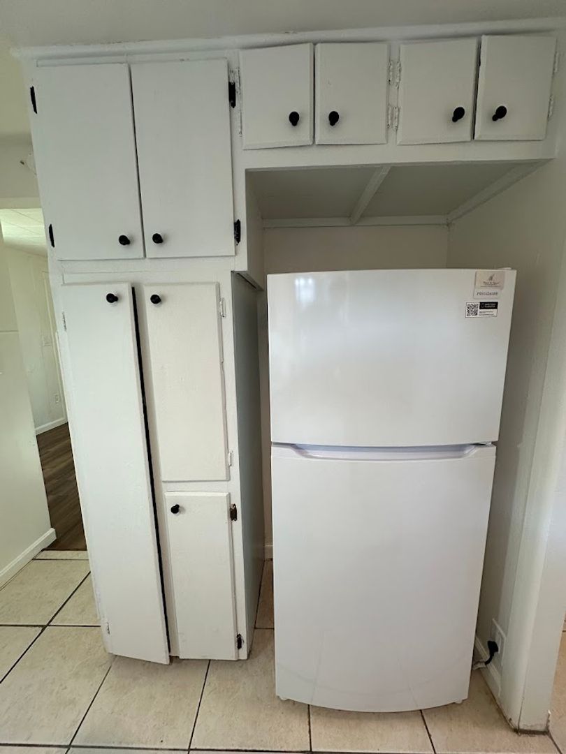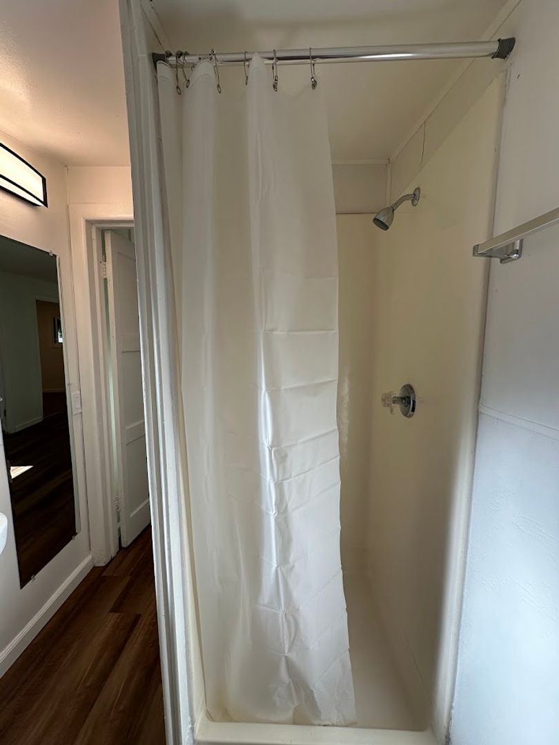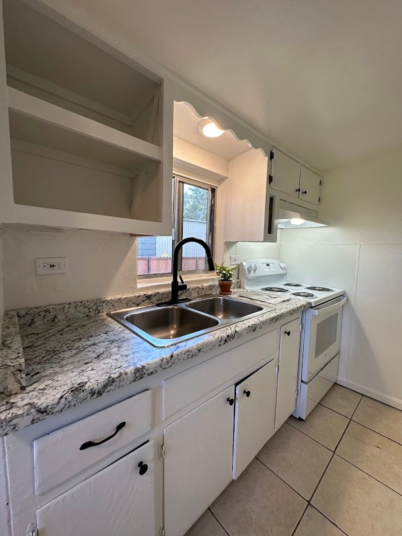 The bathroom offers a practical step-in shower, while the kitchen truly shines with newer appliances, countertops, and white cabinetry accented by sleek black hardware. Inside laundry hookups add everyday ease, and the yard provides additional outdoor space to enjoy.